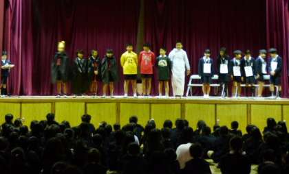 「バランスのよい食事」をテーマに、劇やクイズを通して、野菜や魚などいろいろな食べ物をバランスよく食べることの大切さを伝えてくれました。