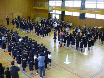 今朝の児童集会の時間に、1年生から5年生までが講堂に集まり、「卒業を祝う会」の練習をしました。