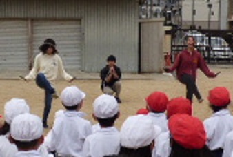 はじめに、「三重跳び」や「四重跳び」、「おしり跳び」など、難しい技や面白い技を織り交ぜたパフォーマンスをみせていただき、子どもたちは目を丸くして見入っていました。