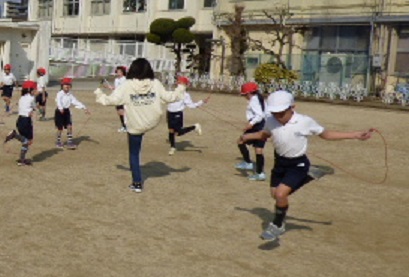 次に、3つのグループに分かれ、なわとびのコツをていねいに教えてもらいました。初めて跳べた子や今までよりたくさん跳べるようになった子がたくさんいました。