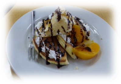 できたホットケーキには、フルーツを添えたり、チョコレートでデコレーションしたりしました。