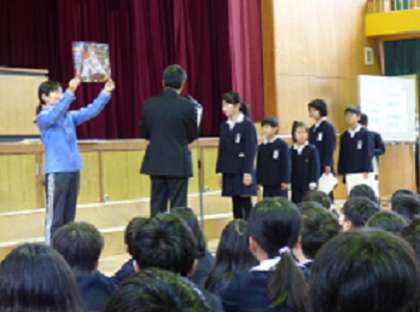 2つめは、図書委員会からの「年間たくさん本を読んだ児童」への表彰です。学年で一年間に一番たくさん本を読んだ児童に対して、図書委員会が作成した賞状が贈られました。