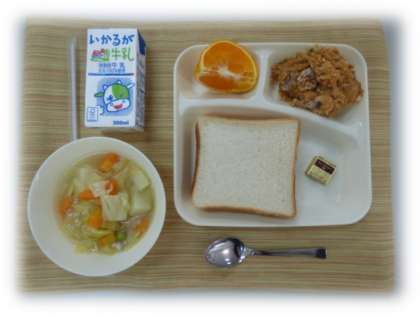 メニューは「食パン・バター・牛乳・とうふのミートグラタン・押し麦と野菜のスープ煮・デコポン」でした。