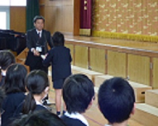 1年生からは、3人の代表が前に出て、今年がんばったことやできるようになったこと、また来年がんばりたいことなどを、全校児童に発表しました。