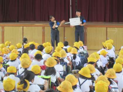 始業式後の3限目に、校内での不審者対応の防犯訓練に取り組みました。続けて、淀川区役所から「セーフティーよどがわ」の方に来ていただき、普段の生活の中で不審者に気をつけることについてのお話をしていただきました。