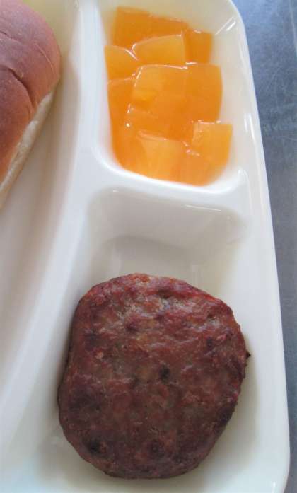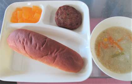 今日の給食は、焼きハンバーグ、豆乳スープ、ダイスゼリー(みかん🍊)、黒糖パン、牛乳🥛です。