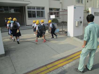 写真は、今朝も子ども見守り隊の見守りの下、元気に登校する子どもたちの様子です。