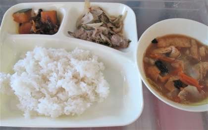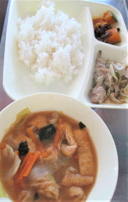 今日の給食は、ぶた肉🐖の甘辛焼き、みそ汁、かぼちゃのいちこ煮、ごはん🍚、牛乳🥛です。