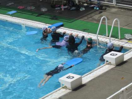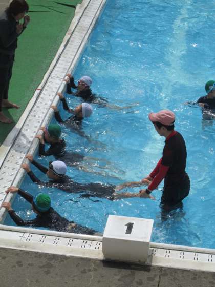 今日の3限目に、1年生のプール水泳がありました。「ばた足」や「ふしうき」など、それぞれのああてをに向けて練習に取り組みました。