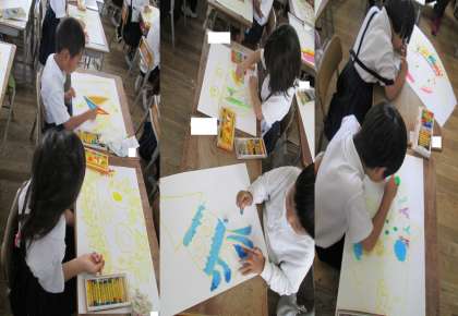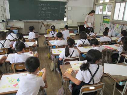 1年生が図画工作の時間に描画に取り組んでいます。自分でイメージした不思議な魚を、クレヨンで画用紙に描いていきます。子どもたちは、形、模様、色の組み合わせなど、工夫しながら描き進めています。
