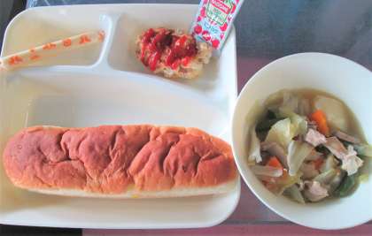 今日の給食は、とうふロール、洋風煮、棒チーズ、おさつパン🍞、牛乳🥛です。