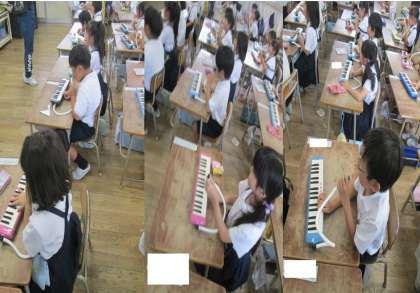 1年生が音楽で鍵盤ハーモニカを使って演奏しました。教材曲「どんぐりさんの おうち」を「ド」の階名で、楽しみながら演奏しました。