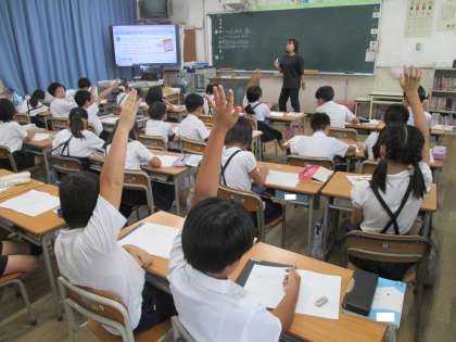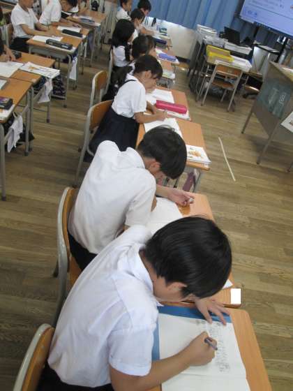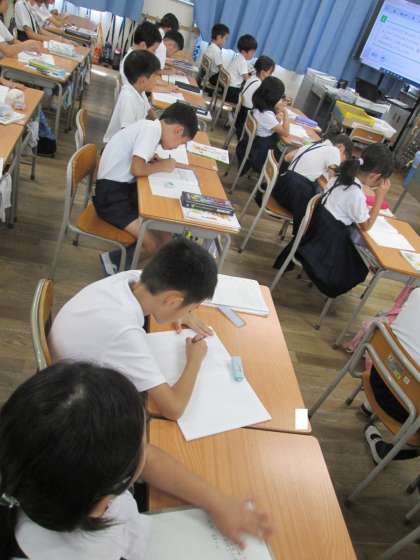3年生が算数で「あまりのあるわり算」の学習に取り組んでいます。この時間は、文章題の意味をとらえて、23÷4 と立式し、計算して答えを求める課題解決に取り組んでいます。子どもたちは、とても集中して学習しています。