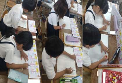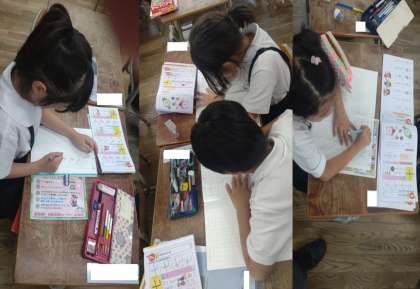 1年生が漢字やカタカナの学習に取り組んでいます。漢字ドリルや漢字ノートに丁寧に新出漢字やカタカナを書いています。