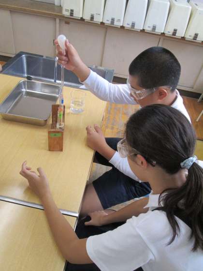 6年生が理科で「水溶液と金属」について学習しています。金属にうすい塩酸を加えたときの変化を実験で観察しています。写真は、昨日の4限目の実験の様子です。