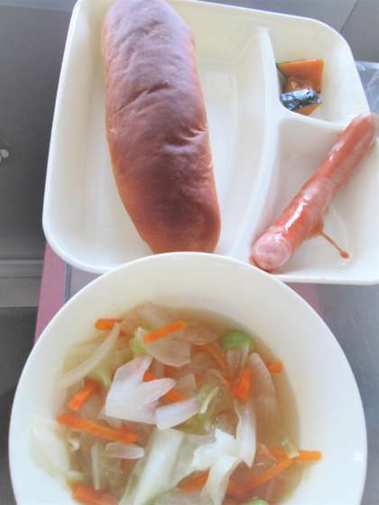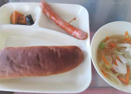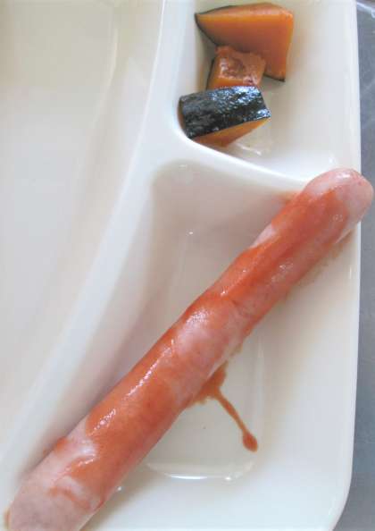 今日の給食は、ウインナーのケチャップソース、スープ、焼きかぼちゃ、黒糖パン、牛乳🥛です。