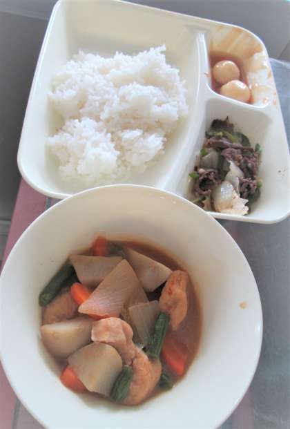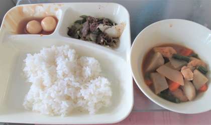 今日の給食には、「一口がんもとさといものみそ煮」と「みたらしだんご」が出ます。