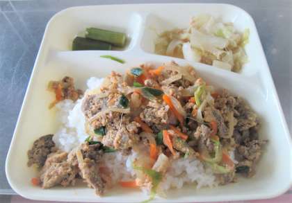 今日の給食は、他人丼、ささみとキャベツのいためもの、オクラの甘酢あえ、牛乳🥛です。