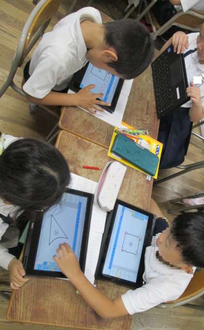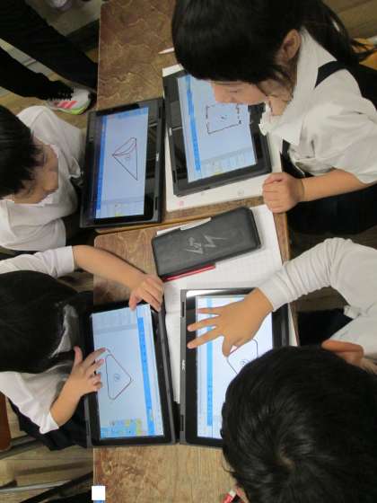 対話的な学習として、グループでタブレットを活用して話し合い活動に取り組みました。三角形・四角形の定義をもとに、タブレットで図形を示しながら交流を深めました。