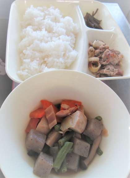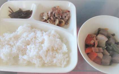 今日の給食は、豚肉🐖の梅風味焼き、ふきよせ煮、くきわかめのむつくだ煮、ごはん🍚、牛乳🥛です。