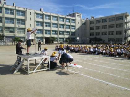 下段の写真は、集会委員会の子どもたちが、今回の「猛獣狩りに行こうよ」のお手本を示している様子です。