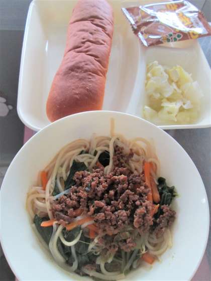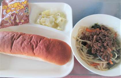 今日の給食は、タンタンめん、キャベツの甘酢づけ、おさつチップス、黒糖パン、牛乳🥛です。