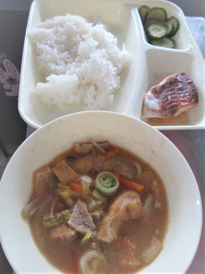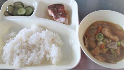 今日の給食は、あかうおのしょうゆだれかけ、豚汁、きゅうり🥒のゆず風味、ごはん🍚、牛乳🥛です。