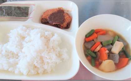 今日の給食は、みそカツ、じゃがいも🥔と野菜🥕の煮もの、焼きのりのり、ごはん🍚、牛乳🥛です。