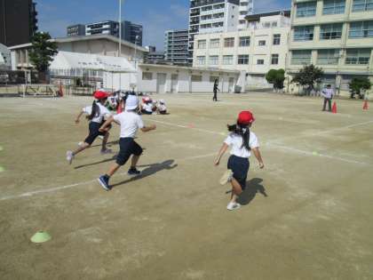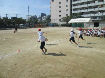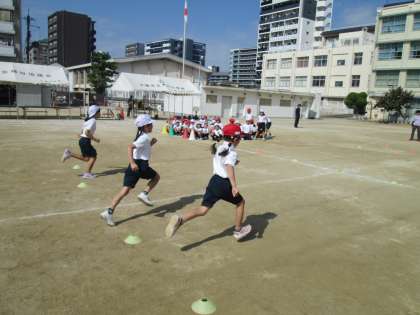 写真は、1年生の個人走の練習の様子です。体育では1年生は「かけっこ遊び」として、いろいろな走り方を経験し、その時の身体感覚を味わえるようにすることが目標です。運動会では、まっすぐ前を見て走ることが動きのポイントになります。