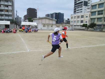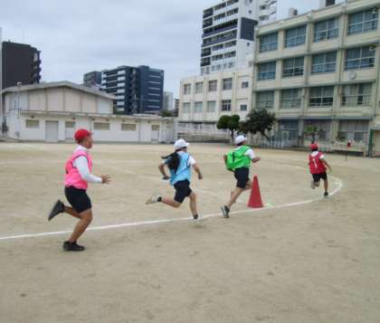写真は、リレーの練習で全力疾走する子どもたちの様子です。