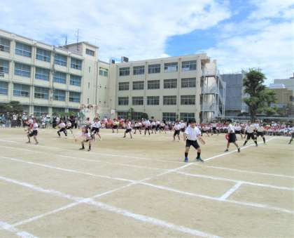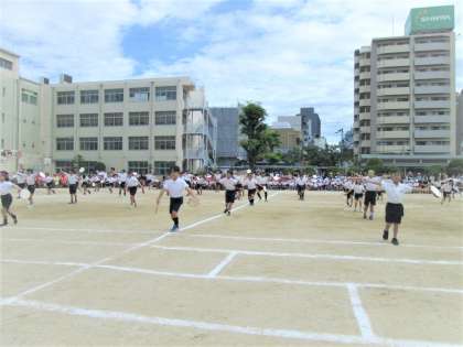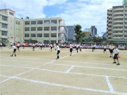 4年生の団体演技「魂をこめて」は、エイサーの掛け声が運動場に響きわたり、沖縄の風が吹いていました。2部構成で、テンポの早い曲もリズムに合わせてダイナミックに踊っていました。