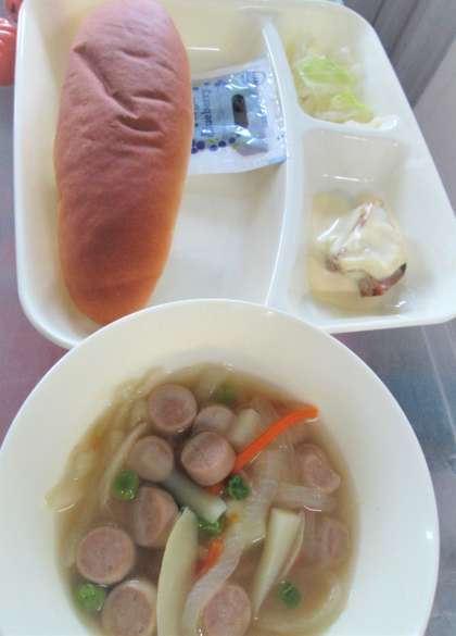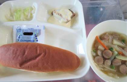 今日の給食は、かつおのガーリックソースかけ、ウインナーとじゃがいものスープ、キャベツのサラダ、コッペパン、ブルーベリージャム🍇、牛乳🥛です。