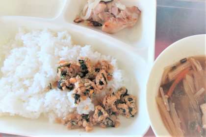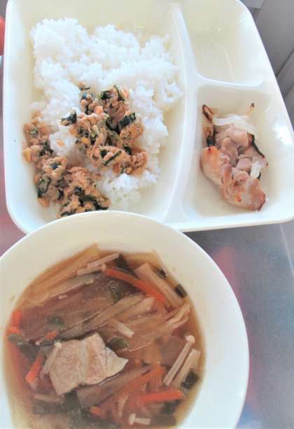 今日の給食は、鶏肉🐣のゆず塩焼き、ソーキ汁、ツナ大豆そぼろ、ごはん🍚、牛乳🥛です。