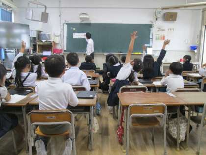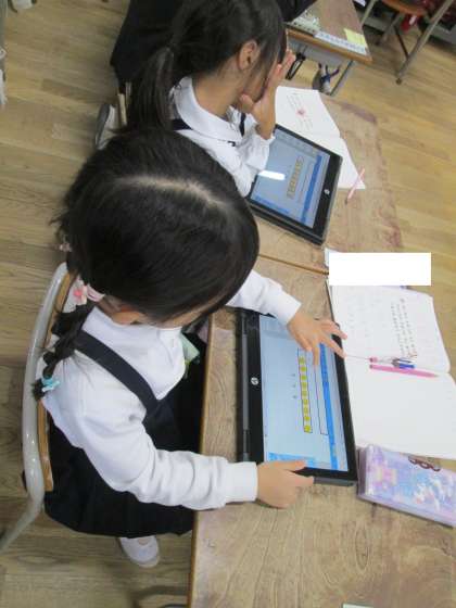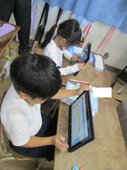 今日の5限目に、教育委員会から講師の先生に来ていただき1年生の研究授業がありました。単元「たしざん」の学習で、1位数どうしの繰り上がりのある加法計算を理解する学習でした。子どもたちは、発表も積極的で、タブレットPCを活用して課題解決に取り組んでいました。