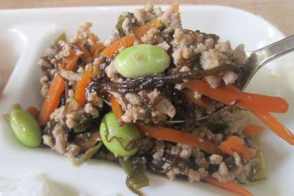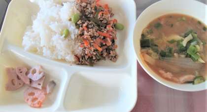給食のジューシーは、豚ひき肉、にんじん🥕、むきえだまめ、もずく切りこんぶ、などを使った、たきこみごはん🍚風です。ご飯と具を混ぜて食べましょう。