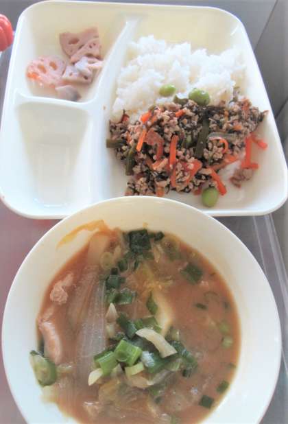 今日の給食は、もずくと豚ひき肉のジューシー、じゃがいもの🥔みそ汁、焼きれんこんごはん🍚、牛乳🥛です。