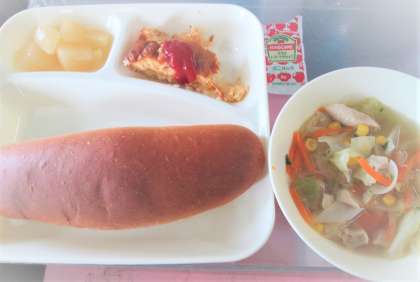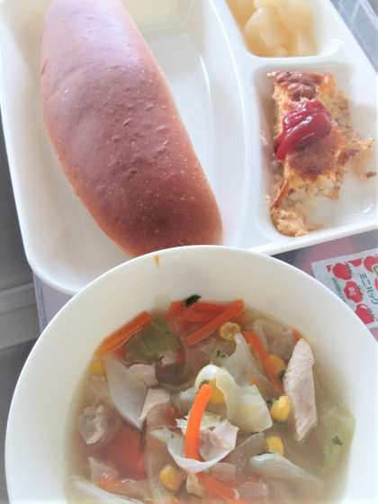今日の給食は、ツナポテトオムレツ、スープ、洋なし(カット缶)、黒糖パン、牛乳🥛です。