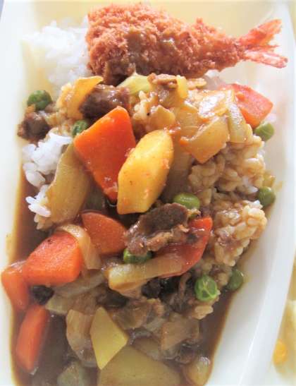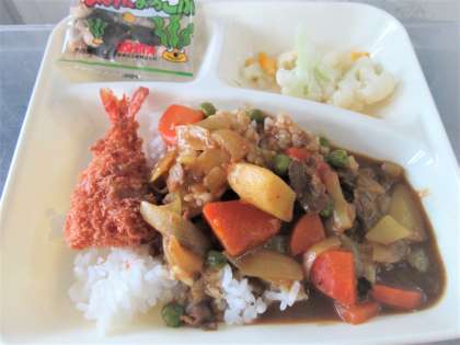 今日の給食は、えび🦐フライカレーライス🍛、カリフラワーのピクルス、豆こんぶ、牛乳🥛です。