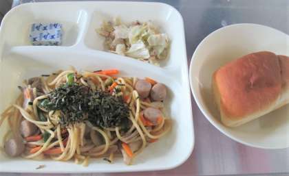 今日の給食は、ウインナーときのこ🍄の和風スパゲティ、焼きツナキャベツ、固形チーズ🧀、ミニコッペパン、牛乳🥛です。