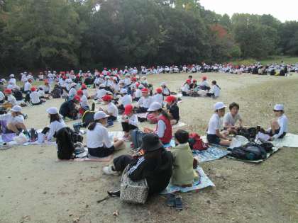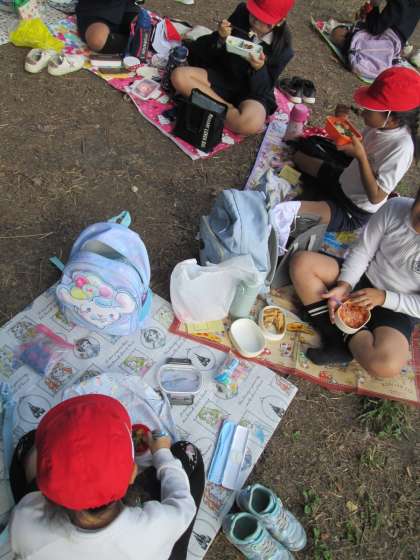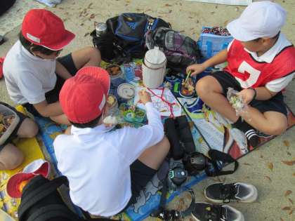 芝生の上で子どもたちが楽しみしていた、お弁当タイムです。たてわり班で楽しく食べました。
