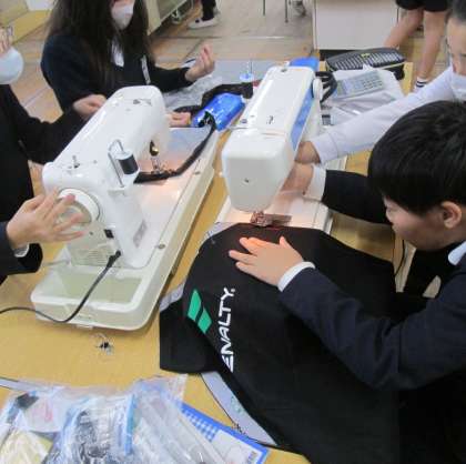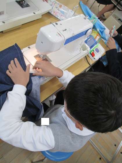 5年生が家庭科で「エプロンづくり」に取り組んでいます。友だちと協力しながらミシンの操作などに熱心に取り組んでいました。