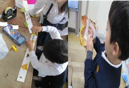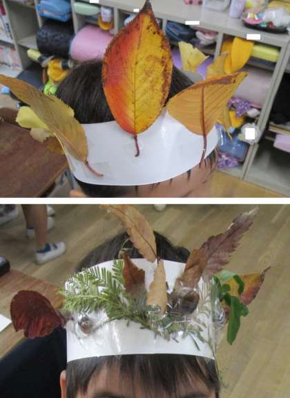 公園から学校にもどると、次は、「王冠づくり」をしました。公園で見つけてきた、落ち葉やどんぐりをデコレーションして王冠をつくります。子どもたちは、創意工夫しながら自分だけの王冠を一生懸命に作っていました。