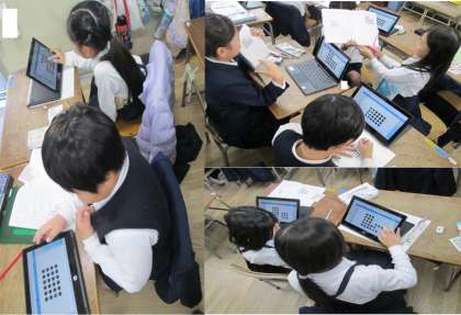タブレットPCを活用して、いろいろな求め方を考えました。ベアやグループでも、交流して考え方を伝え合いました。発表して全体交流で、考え方を共有しました。、