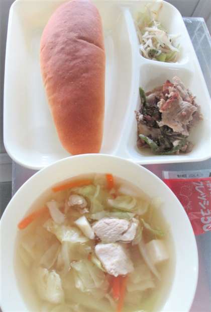 今日の給食は、豚肉のオイスターソース焼き、中華スープ、チンゲンサイともやしの中華あえ、コッペパン、いちご🍓ジャム、牛乳🥛です。