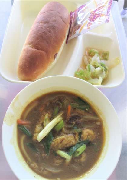 今日の給食は、カレーうどん、はくさいのおひたし、いもけんぴフィッシュ、おさつパン、牛乳🥛です。
