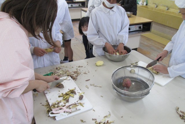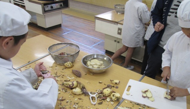 なかよし学級の高学年の子どもたちが、おいもパーティーに向けて下準備をしました。おいもの皮をむいたり、切ったりして調理をはじめる前の必要な工程を熱心に取り組みました。