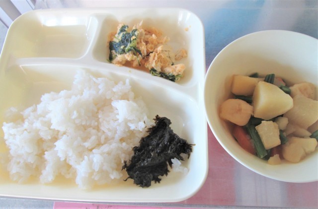 今日の給食は、卵🥚の千草焼き、のる天と野菜のつくだ煮。ごはん🍚、牛乳🥛です。