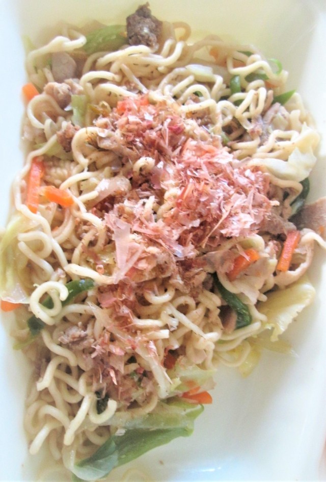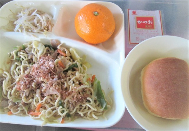 今日の給食は、和風焼きそば、もやしのしょうがづけ、みかん🍊、ミニコッペパン、牛乳🥛です。