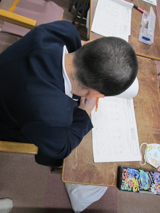 なかよし学級で算数の学習に取り組んでいます。プリントを使って、「重さのたんい」の課題を解決しています。