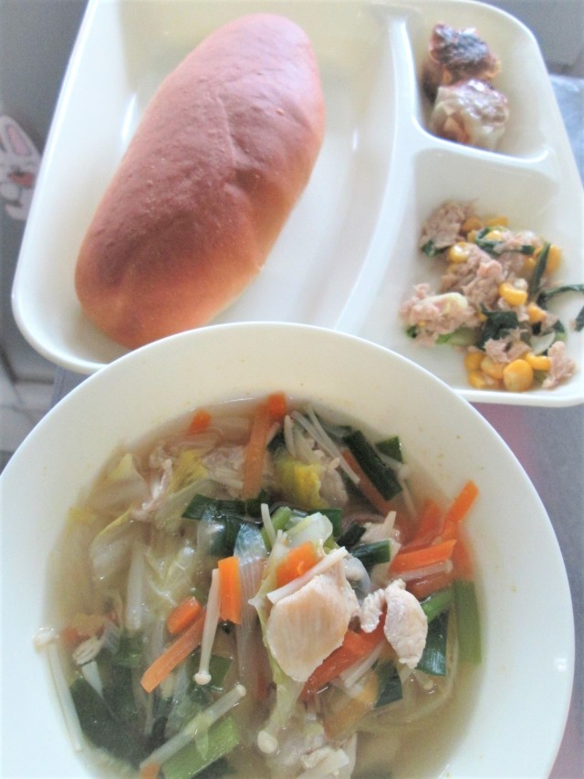今日の給食は、焼きシューマイ、中華スープ、ツナとチンゲンサイのいためもの、黒糖パン、牛乳🥛です。